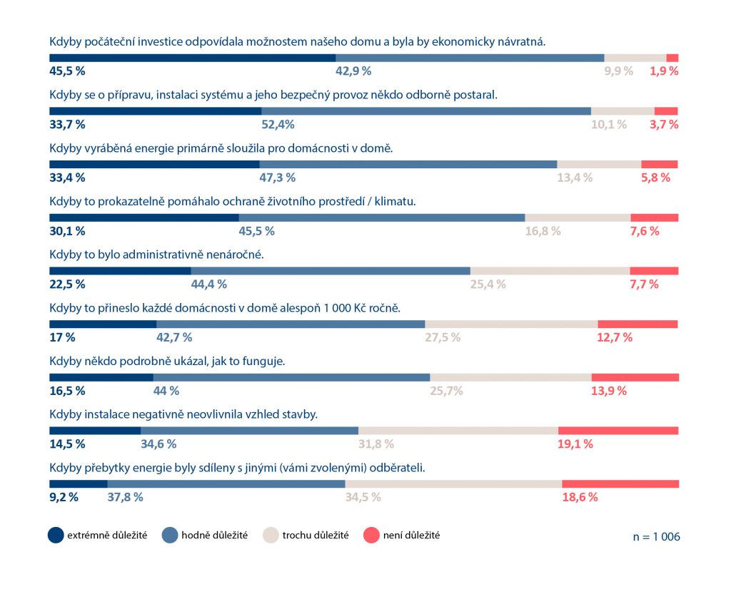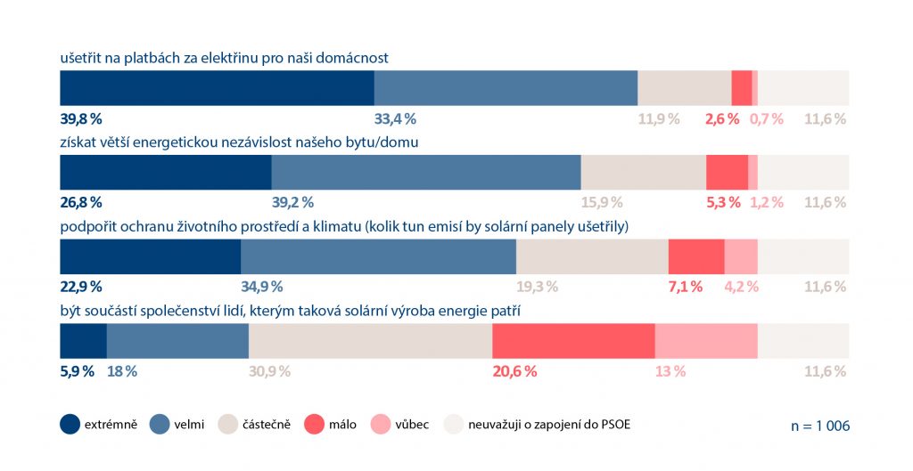 „Skoro tři čtvrtiny oslovených uvádí, že je extrémně nebo velmi silně motivuje úspora na platbách za elektřinu k osazení domu solárními panely. Dvě třetiny pak jako extrémně a velmi motivující vnímají energetickou nezávislost pro své bydlení, a bezmála tři pětiny zdůrazňují svou motivaci chránit životní prostředí a klima. Nejméně motivující je pak pro dotazované komunitní charakter takového projektu, uvádí ho jako silnou motivaci 24 %.“