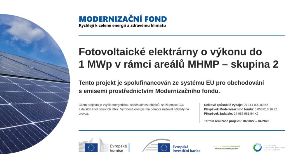 Jedná se o fotovoltaické elektrárny s termínem ukončení do 13.4. 2026. Celkové způsobilé náklady činí 29 141 000,- Kč, příspěvek Modernizačního fondu 5 058 018,16 Kč. Příjemce podpory přispívá částkou 24 082 981,84 Kč.
