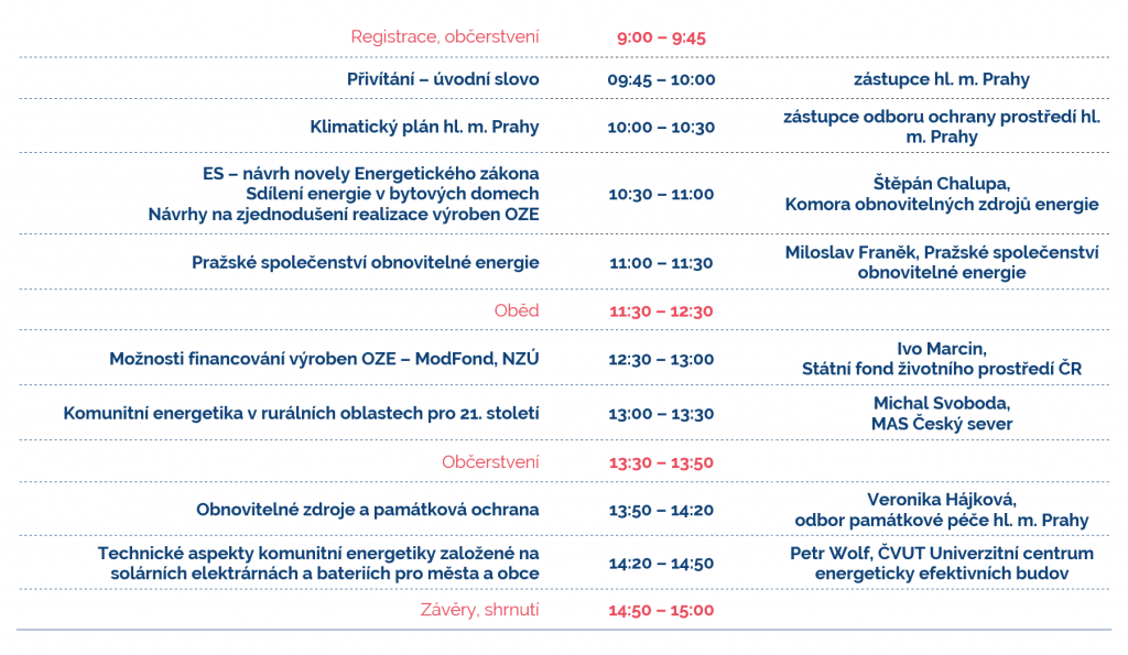 Zajímá Vás, jakou roli hrají města a obce v energetických společenstvích obnovitelných zdrojů? Rádi byste se dozvěděli o cílech Klimatického plánu Prahy do roku 2030 a o tom, jak komunitní energetika ovlivní rozvoj měst a obcí? Chcete vědět více o možnostech financování výroben obnovitelných zdrojů energie? Jaké jsou technické a právní aspekty komunitní energetiky založené na solárních elektrárnách a bateriích pro města a obce? Pražské společenství obnovitelné energie ve spolupráci s Magistrátem hlavního města Prahy pro Vás, představitele měst a obcí, připravili konferenci, kde budeme na tyto otázky odpovídat.