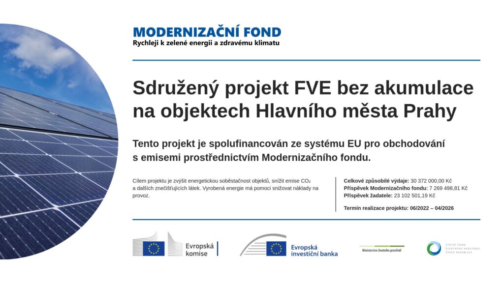 Hlavním záměrem projektu je provést instalaci fotovoltaického systému (FVS) na střechách deseti budov v majetku hlavního města Prahy pro zajištění větší energetické soběstačnost objektů, snížení emisí CO2 a dalších znečišťujícíh látek. Vyrobená energie má pomoci snižovat náklady na provoz těchto objektů (číslo žádosti 72111000 90).